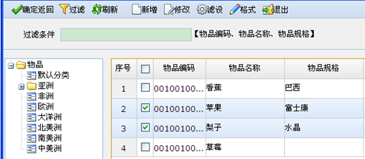 【第三步】输入“参照多选最大数目”,也即参照录入时,最多可选择的记录数目。最多可选50个。应用举例:在进货单参照录入物品时,点出参照界面如下图,如果最大数目为2,则一次最多可勾选2个物品进行确定返回。