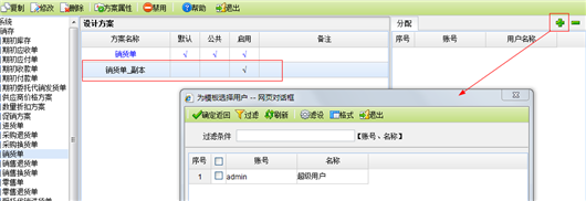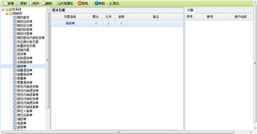 【第五步】单据显示设计完成后,可将方案属性不是“公共方案”的单据设计方案指定用户。在右侧分配页面,对使用该单据的用户进行分配,点“+”分配新用户,点“-”删除已分配的用户。如下图: