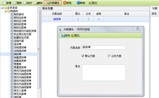 【第三步】点击〖方案属性〗按钮,进入方案属性对话框修改方案名称,默认方案表示默认加载的方案,公共方案表示对所有操作员都可见的方案。修改完成,点击〖保存〗按钮,完成修改。点击〖退出〗,则直接退出对话框,修改后的方案不被保存。如下图所示:
