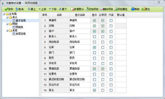 - 在方案格式设置页面选择要在单据中增加显示或隐藏显示的项目。