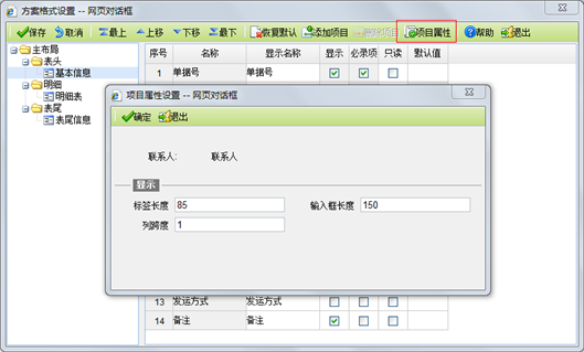 - 点击〖项目属性〗,修改该项目在单据中所显示的属性,其中长度单位为像素。修改完成后,点击〖确定〗按钮,完成保存。如图所示: