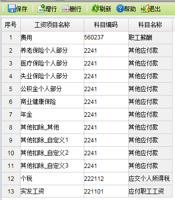 后,在新增行中录入工资项目名称和对应的科目编码。