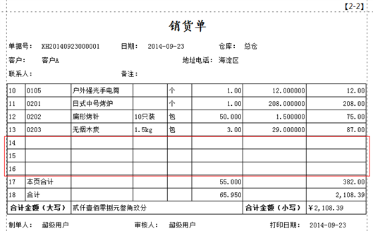 末页补空行:选择此项表示当一张单据打印到最后一页时,如果不满一页,表格数据行之后自动补打空白行直至打满一页,不选则不补空行。例如选中此项,效果如下图所示: