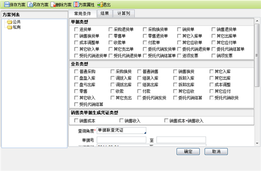 - 点击“财务接口/查询统计/业务单据凭证一览”菜单项,系统弹出如下图所示的查询条件设置窗口。