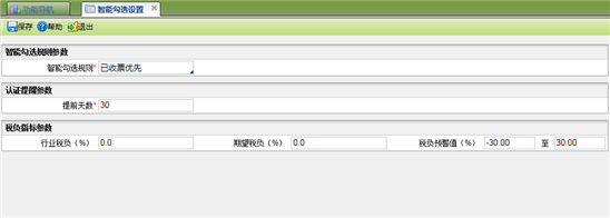 2. 认证提醒天数:发票认证期限360天,指定在到期前多少天给予提醒,在“进项发票/认证提醒查询”页面可以根据此参数查询;同时在进项发票认证页面,智能勾选规则选择“认证天数优先”时,调用此参数值。默认30天。