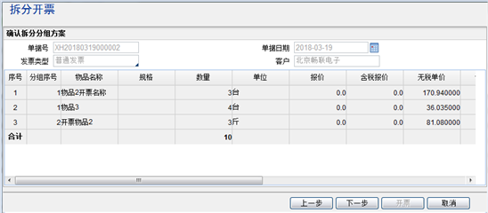 2.每个分组的金额合计必须小于最大开票限额,否则系统提示“序号为xx的分组金额合计超过最大开票限额,无法执行拆分开票。”