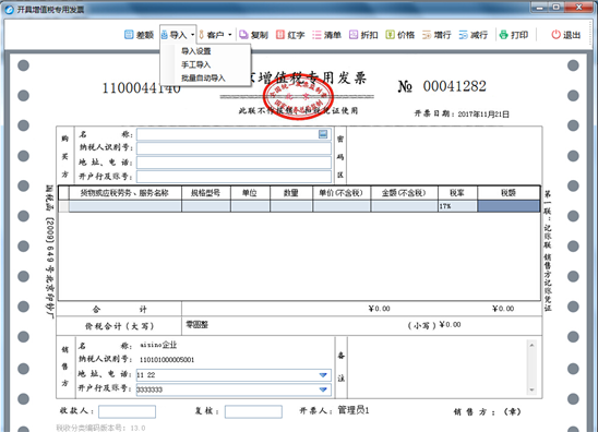 4.进入开票系统-发票开具管理,按发票类型选择开具,以专用发票为例,进入增值税专用发票填开页面,在导入菜单下,可以选择“手工导入”或“批量自动导入”,如下图所示: