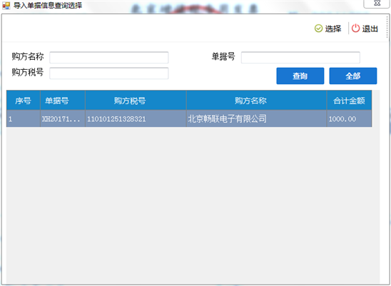 2) 系统显示导入单据查询选择界面,文件中的单据信息会显示在表格中。如下图所示: