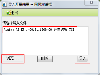 3.用户也可以点击〖导入开票结果〗按钮,如果参数“结果文件路径”未设置,或者设置的路径中没有新的结果文件,则需要点击〖浏览〗选择一个结果文件后点〖导入〗。如下图所示: