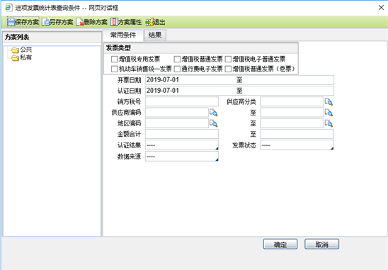 - 点击“查询统计/进项发票统计”菜单项,系统进入进项发票统计查询条件页面,如下图所示: