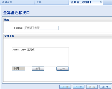 【第二步】选择要引入数据的目标账套,点击〖浏览〗,例如选择金算盘format.ini(会计期间)文件,点击〖上传〗。如下图所示: